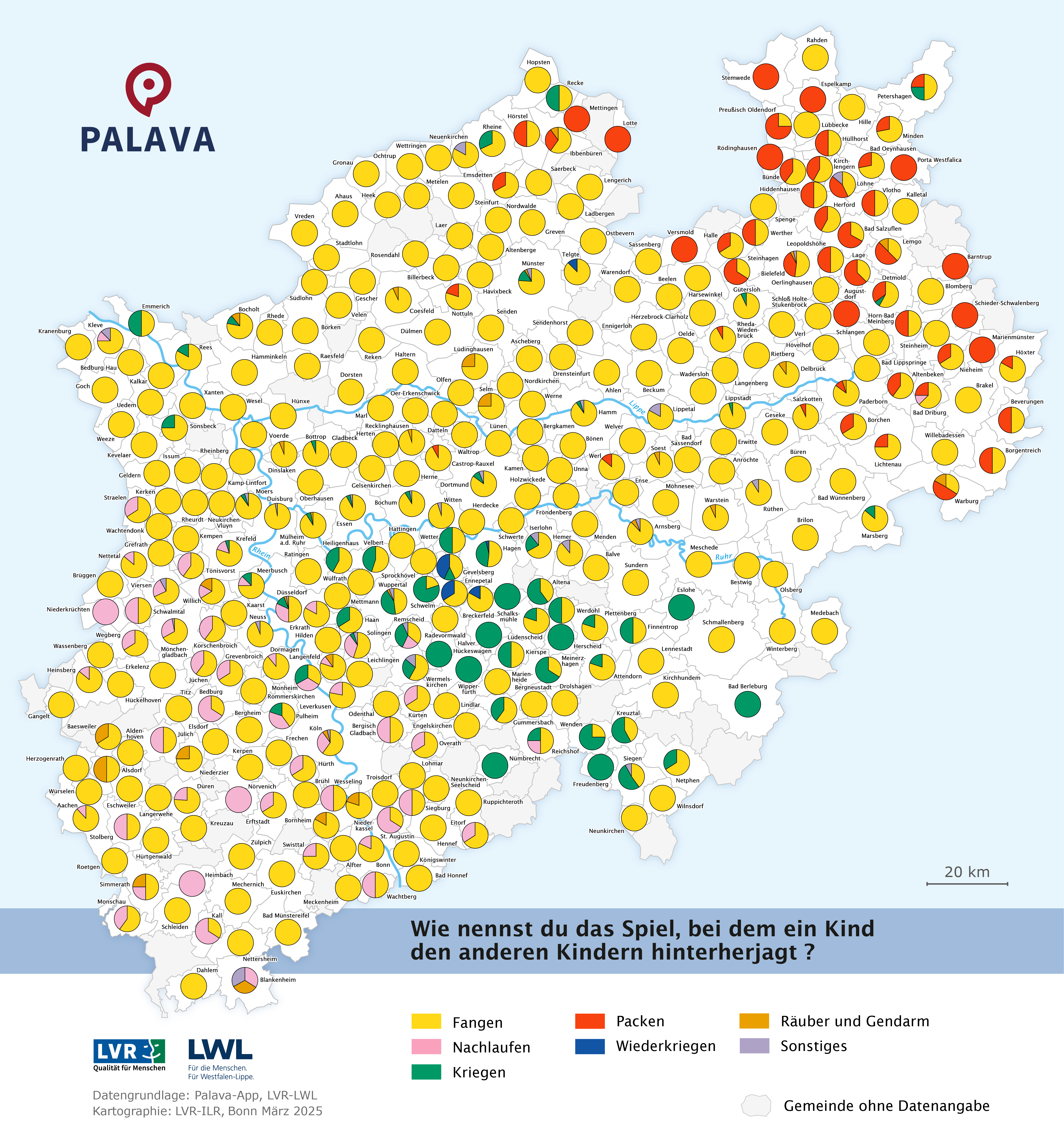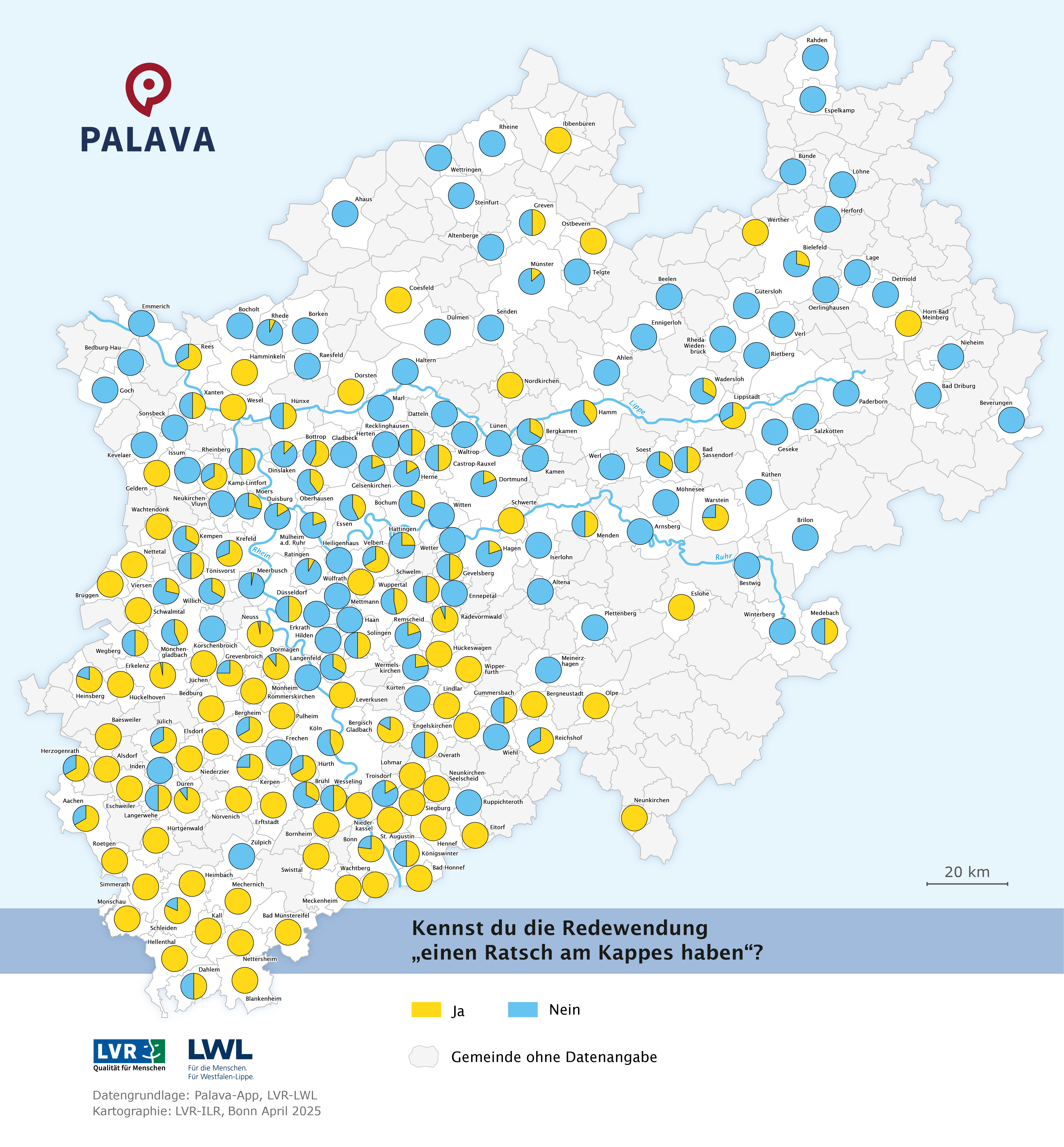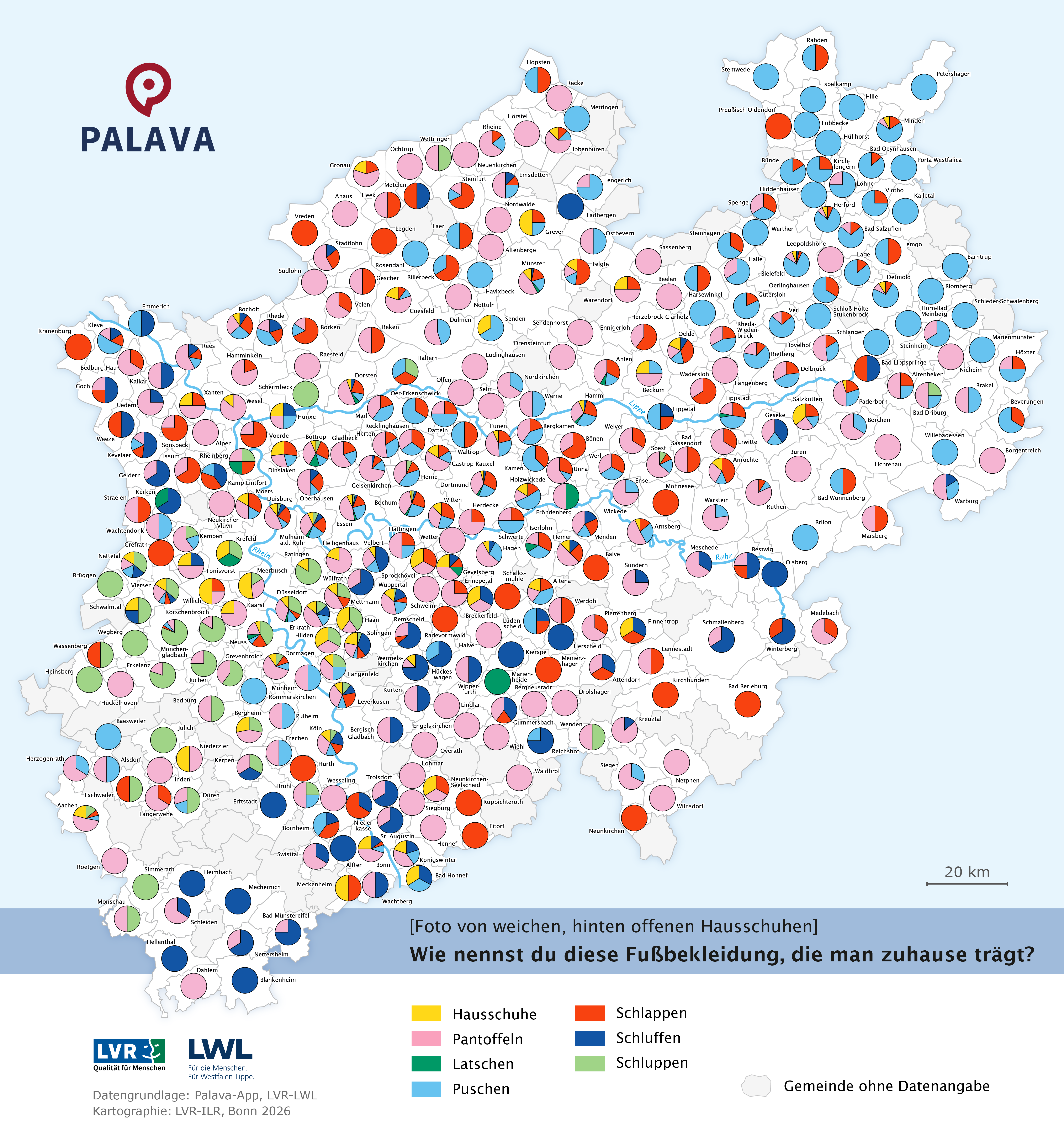 Die Karten bilden die Antworten pro Ort als Kreisdiagramm ab. Dadurch wird sichtbar, welche Antwort wir an einem Ort am häufigsten erhalten haben und andere Nennungen fallen nicht unter den Tisch. Manchmal beruhen diese Diagramme auf sehr vielen Antworten (v.a. in den städtischen Gebieten) und manchmal auch nur auf sehr wenigen oder nur einer Antwort. Falls dein Ort noch nicht dabei ist oder dein eigener Sprachgebrauch fehlt, beantworte gerne noch einige Fragen!